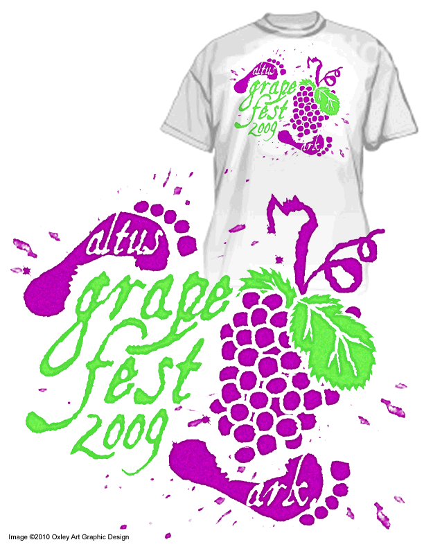 Altus Grape Festival logo 2009 - Fun stuff! This logographic for the Altus Arkansas Annual Grape Festival was inspired by one of the events at the festival, the Grape Stomp Competition. Given that the festival is held in late July, having your feet submerged in grapes might feel pretty good! The festival celebrates the grape harvest and honors the vintners and growers of the area. Rendered as though the imprint is actually grape stains, the bright colors on a white shirt worked out perfectly for this great summer festival.